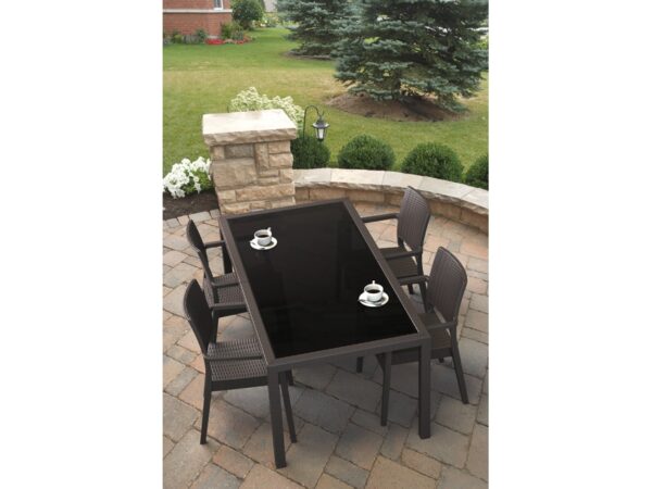Both The Tahiti Table and Panama Armchair are an injection moulded resin, the non-metalic frame will never unravel, rust or decay. Reinforced with glass fibre to strengthen the legs and boost the weight capacity. They are designed for shaded outdoor use, with toughened glass it is stylish and safe, semi UV stable and weather proof. Strong yet lightweight, this table will add class to your venue. It’s sleek profile is pleasant to the eye so this table is as charming as it is functional. Very easy to clean, just hose it down.
