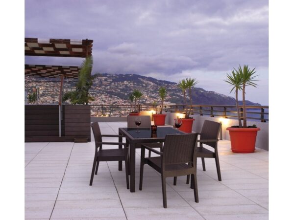 The Ibiza Armchair is an injection moulded resin chair, the non-metalic frame will never unravel, rust or decay, with rattan look seat and back. Reinforced with glass fibre to strengthen the legs and boost the weight capacity. The Ibiza Armchair is stackable, designed for outdoor use, UV stable and weather proof, it will not fade or go brittle in Australia’s harsh outdoor conditions. Strong yet lightweight, this chair will add class to your venue. It’s sleek profile is pleasant to the eye so this chair is as charming as it is functional. Very easy to clean, just hose it down.