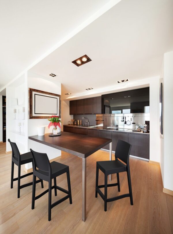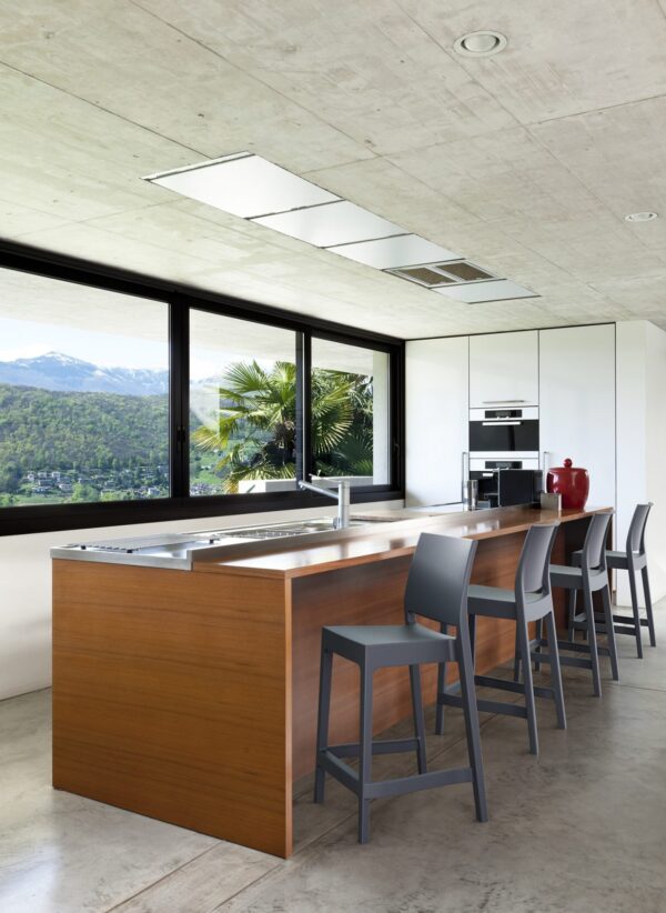 Maya stacking bar stool h.65 cm is produced with a single injection of polypropylene reinforced with glass fiber obtained by means of the latest generation of air moulding technology with neutral tones. For indoor and outdoor use. Available in Black, Dark Grey, Taupe and White.