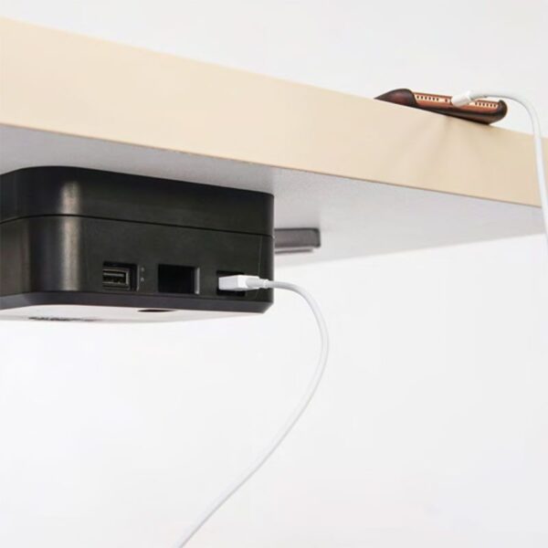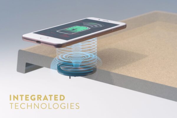 Integrated into the mass and invisible on surface, the charging areas merge with the decor using a simple marking on the table top. This ensures the furniture keeps its integrity, giving a perfect smooth touch and refined design.