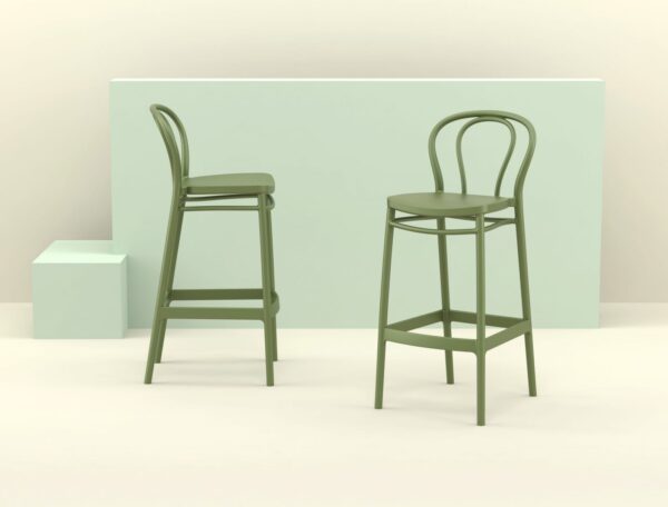 Victor bar stool height 75 cm is produced with a single injection of polypropylene reinforced with glass fibre obtained by means of the latest generation of air moulding technology with neutral tones. For indoor and outdoor use.