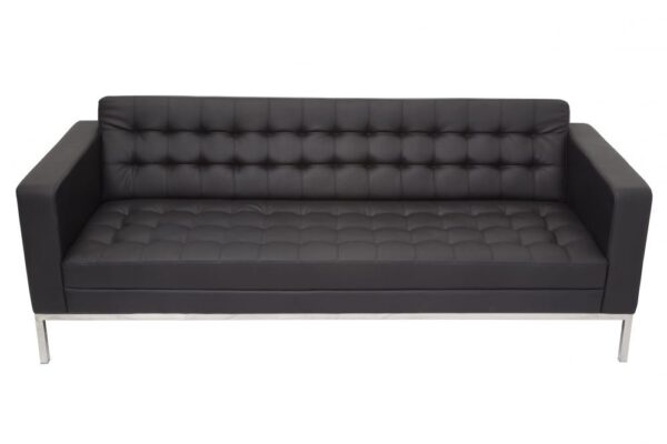 Elegant reception area three seater arm chair with button finish to black PU, easy clean upholstery. Stainless steel underframe and legs.
