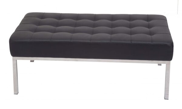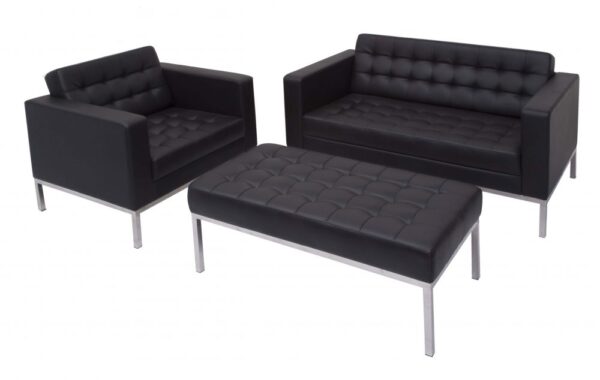 Add this ottoman to your Venus reception suite. Use as footstool or table. Button finish to black PU, easy clean upholstery. Stainless steel underframe and legs.