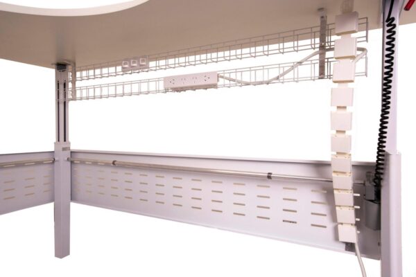 - Fitted with brackets to connect to the underside of the desk and back to the fixed cable tray below.